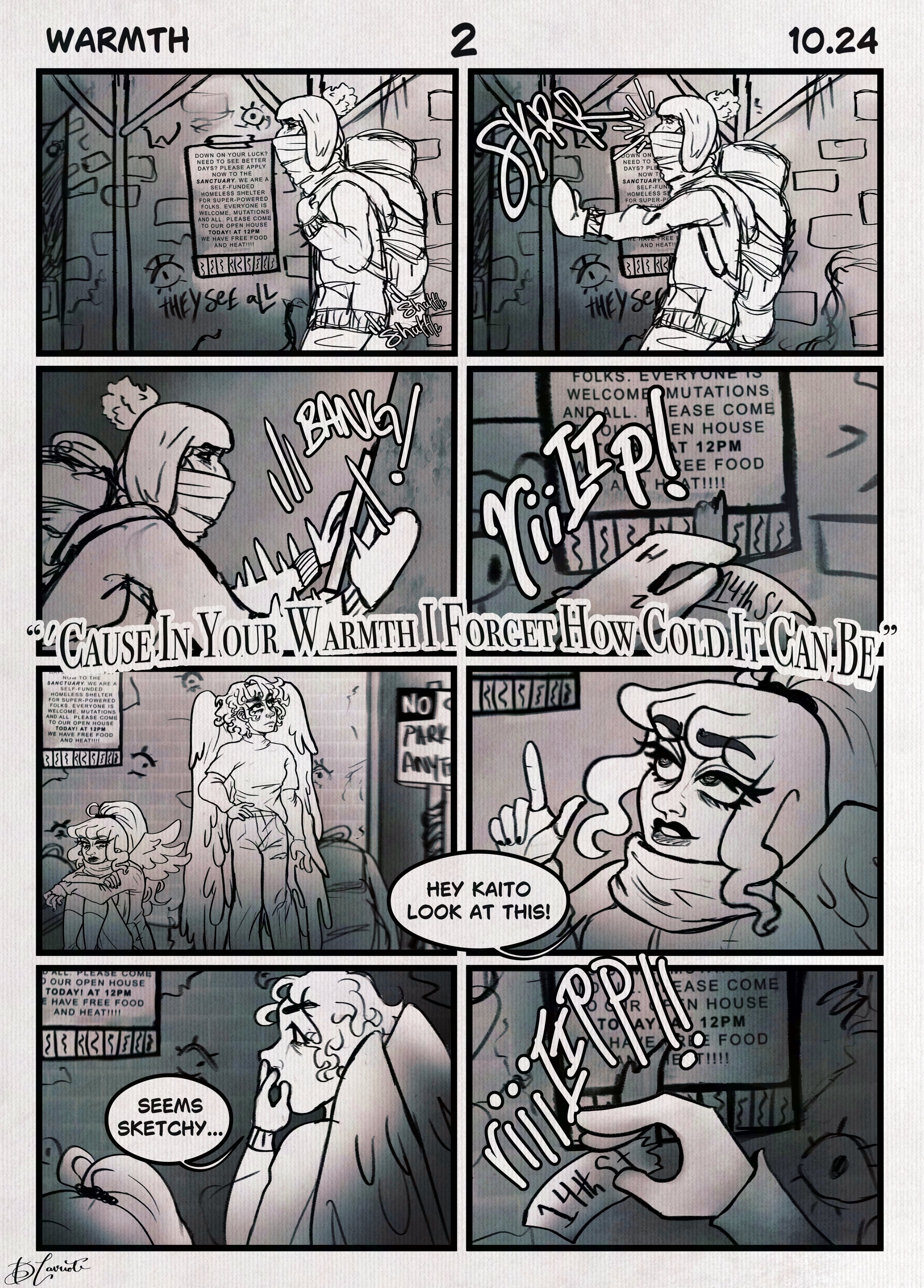 A short comic introducing The Deserters' characters and stories. It tells about hope and belonging through a group of super-powered outcasts trying to survive. Siblings Callisto and Adselia build a Sanctuary, a safe place for those rejected by society. With new friends, they exchange cold nights for warmth, fear for community, and doubt for a fresh start. Introducing the winged siblings Kaito and Shiho, and a cloth mummy named Jordanna.